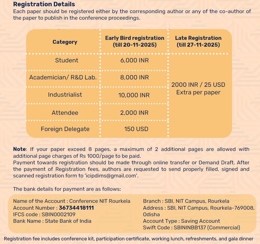 Please ensure that each author submits no more than three papers in total, regardless of their author position. Paper ID *Paper Title *Presenter DetailsPresentation Type (In-Person) *Poster PresentationOral PresentationName of the Presenter *Instittue / University Name *Email Address *Mobile *Select *IndianForeignerSelect *StudentAcademic / Govt. ProfessionalIndustrialistRegistration Fee Payment DetailsNo. of formatted pagesSpringer Lecture Notes format6 pages (Rs. 0 extra page charge)7 pages (Rs. 0 extra page charge)8 pages (Rs. 0 extra page charge)9 pages (Rs. 1000 extra page charge)10 pages (Rs. 2000 extra page charge)Total amount paid *Date of transaction/ payment *Transaction reference number (UTR) *Payment Proof (JPG/JPEG/PDF) *Choose FileNo file chosenDelete uploaded fileAccommodation requirement *YesNoAccomodation CategeoryAccomodation CategeoryHostel (sharing Rs.250 per day per person)Hostel (Independent Rs.350 per day per person)Guesthouse (sharing Rs.1000 per day per person)Guesthouse (Independent Rs.1500 per day per person)Food Preference *VegNon-VegNARemarksRegister